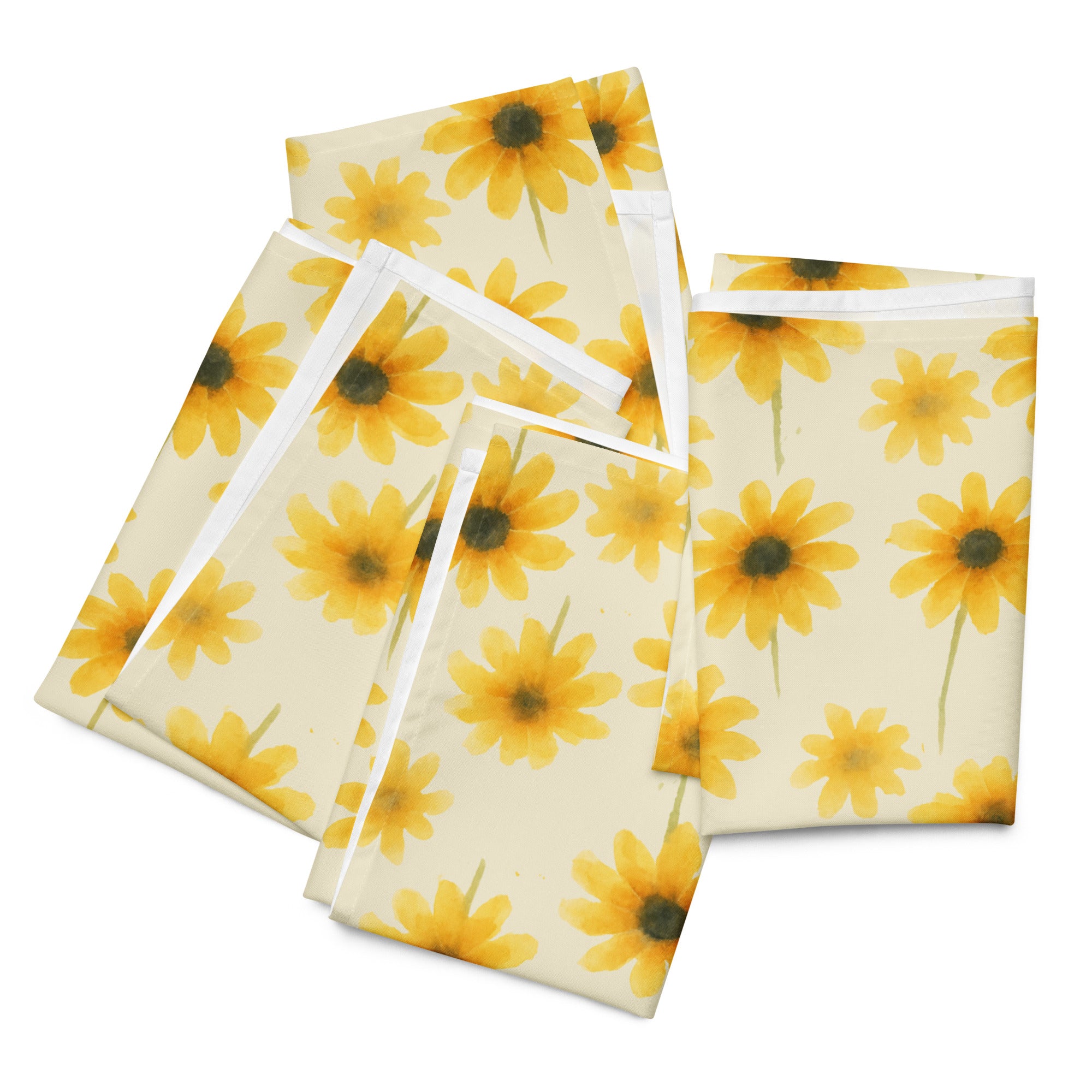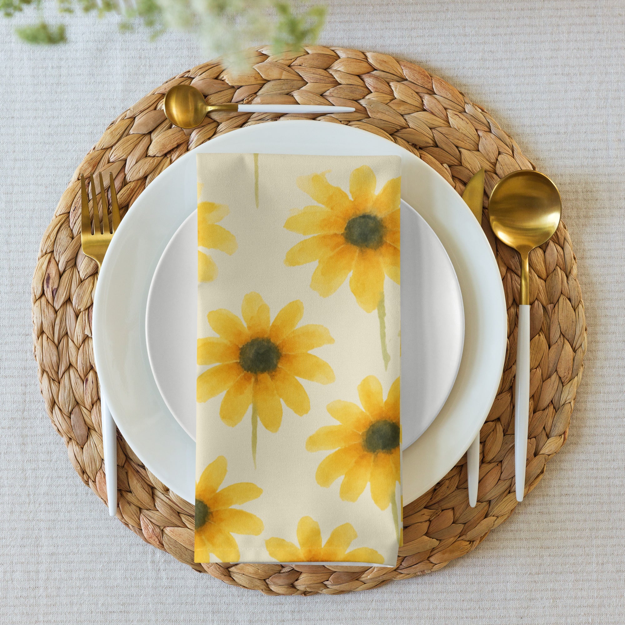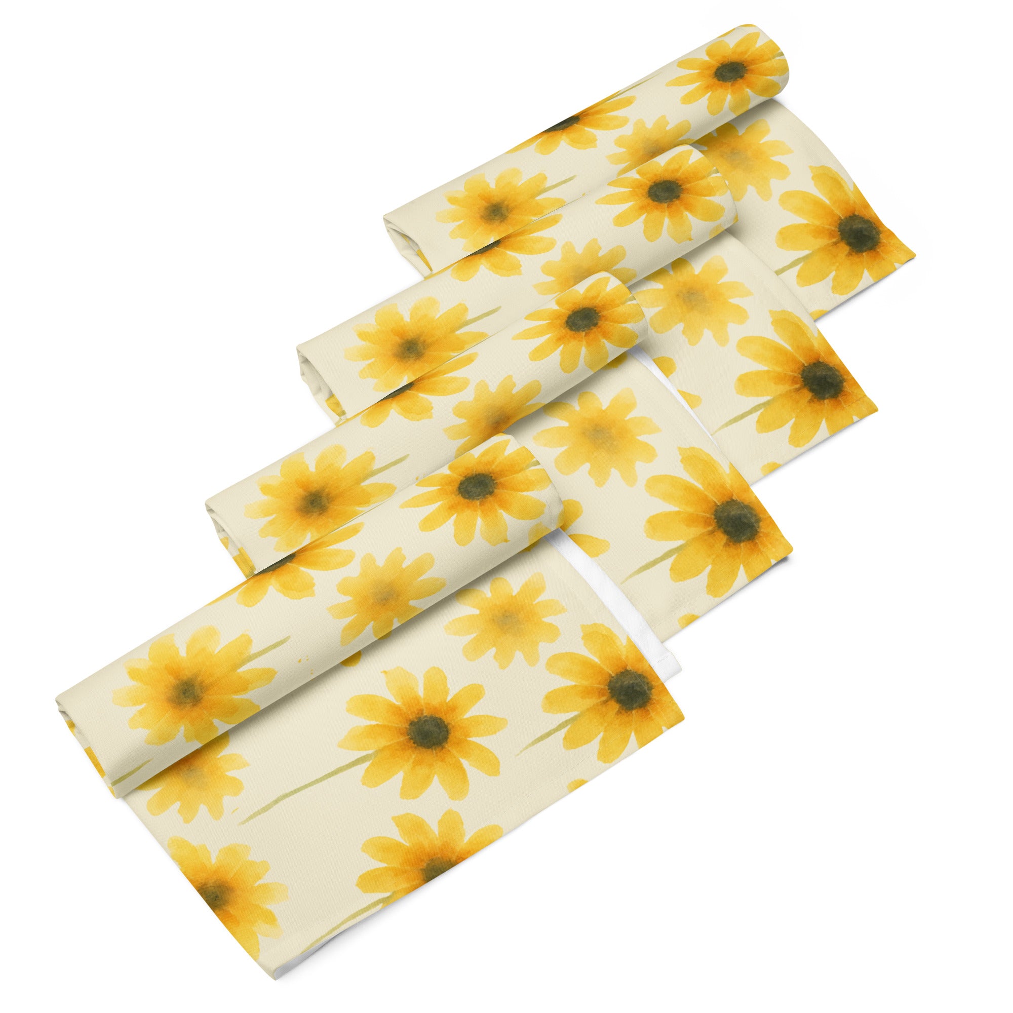The soft, lightweight fabric is durable enough for everyday use yet refined enough for special occasions. Each napkin measures 20″ x 20″ (50.8 cm x 50.8 cm) and features a printed top showcasing a cheerful watercolor-style Black-Eyed Susan motif with a clean white underside for a polished look. Perfect for family dinners, gatherings, or gifting to sustainability-minded friends, this set of 4 blends timeless floral design with meaningful environmental impact.