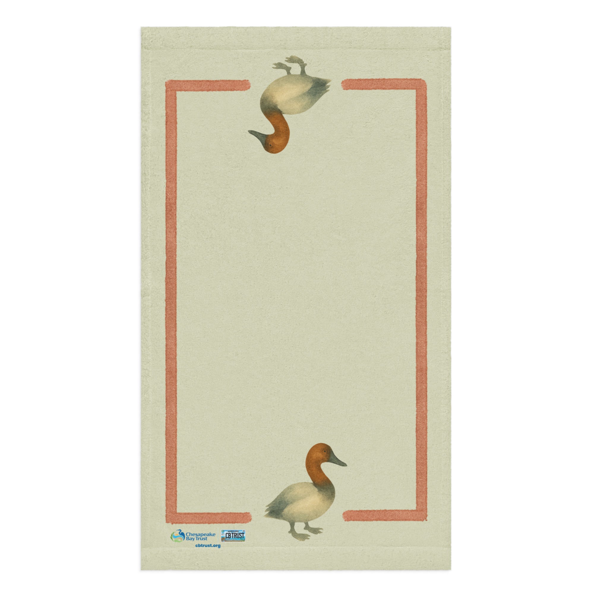 Bring a touch of the Chesapeake Bay into your home with this elegant Canvasback duck tea towel. Featuring a soft watercolor design in warm, neutral tones inspired by the Bay’s most iconic waterfowl, this towel adds natural charm and sophistication to any bathroom or kitchen. Made of 52% polyester and 48% cotton, it offers the perfect blend of softness and durability. The smooth polyester front highlights the detailed watercolor artwork, while the absorbent white cotton back provides comfort and practicality. Both beautiful and functional, it’s ideal for everyday use or as part of a thoughtful, eco-inspired gift. Size: 16″ × 28″